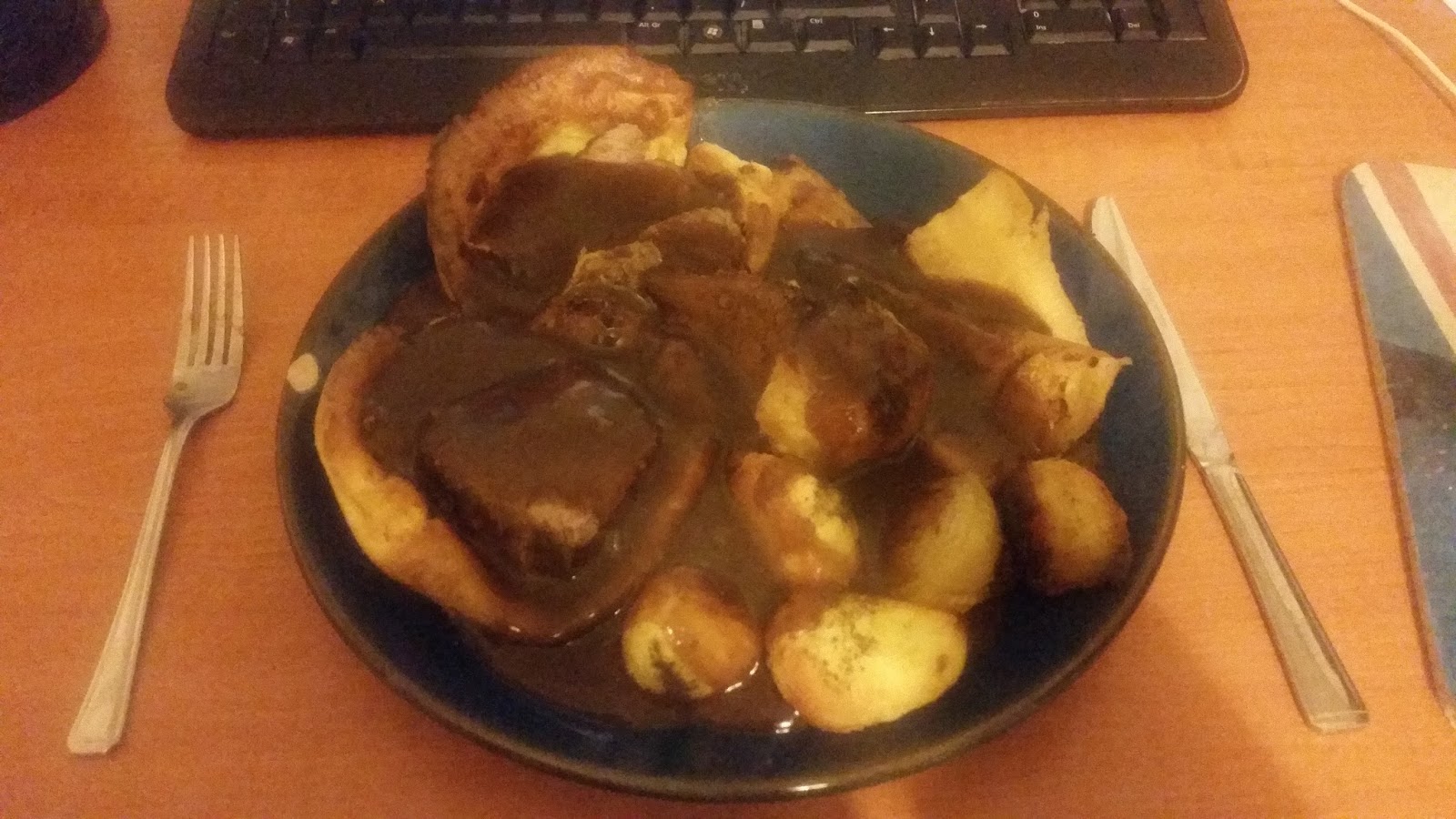 And then I cooked her dinner. Traditional roast beef, of course. Annoyingly I overcooked the beef, but the roast potatoes and parsnips were spot on, and the red wine gravy was very good – my best red wine gravy ever I reckon – though nearly a disaster as I forgot to buy some cornflour, but still managed to thicken it up – although pouring flour straight into it maybe wasn’t the brightest of ideas. Still it tasted excellent.